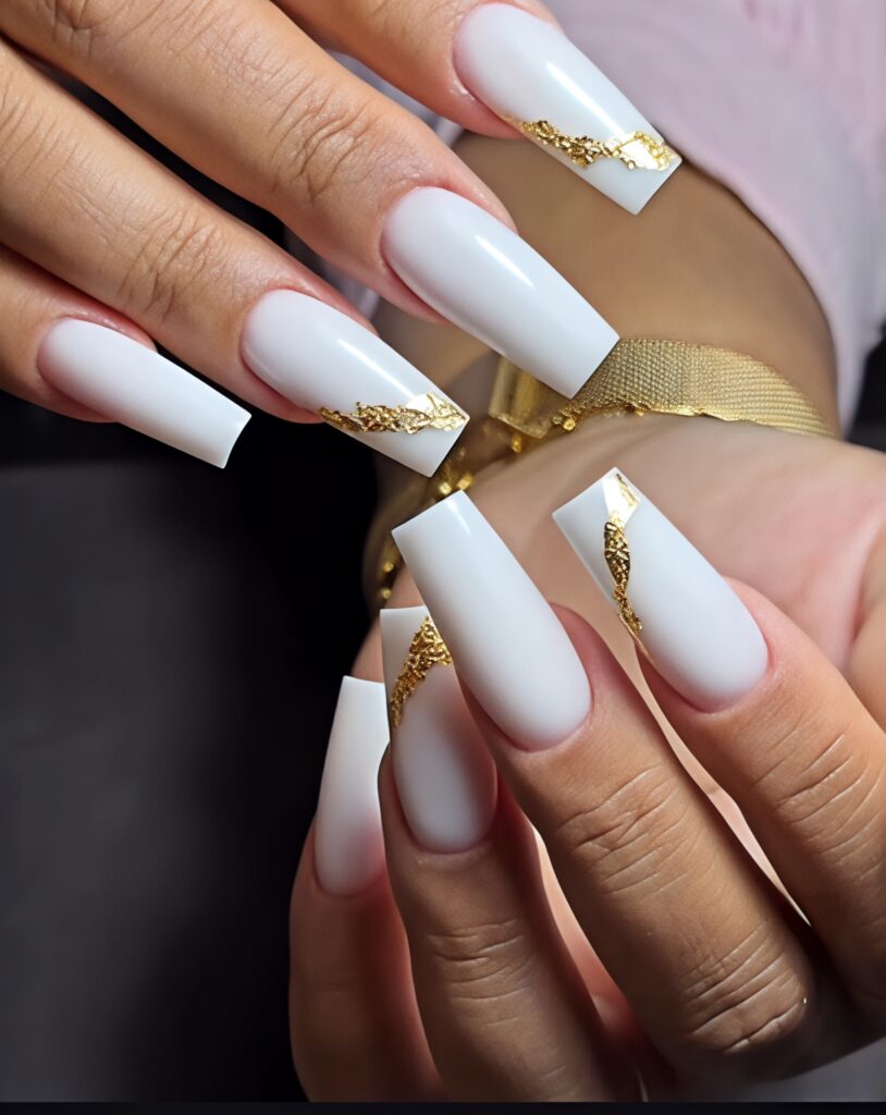 White and gold coffin nails look classy and elegant. The white base gives a clean look while gold foil add shine. This combination is perfect for weddings or special occasions. The coffin shape makes the nails look long and royal. Even though the design is simple it gives a rich and stylish appearance.