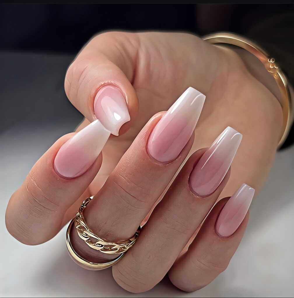 Pink and white ombre coffin nails blend two soft colors smoothly. The light shade change looks very beautiful and modern. This design is perfect for summer because it feels fresh and calm. The coffin shape makes the ombre effect more attractive. You can wear this style daily or at small parties easily.