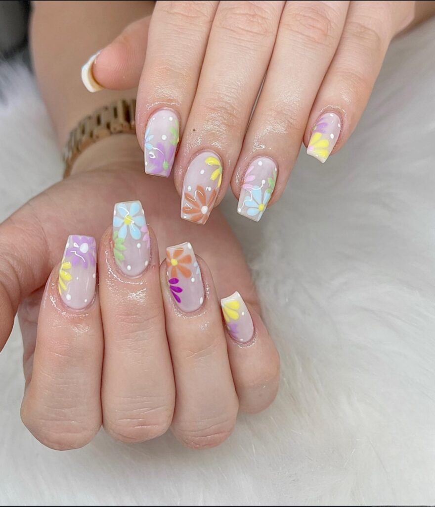 Floral coffin nails are perfect for summer season. Small flower designs on a light base look cute and fresh. The coffin shape gives space to draw neat flowers. This design feels soft and girly. It is great for daytime events and casual outings. Flowers always make nails look lively and bright.