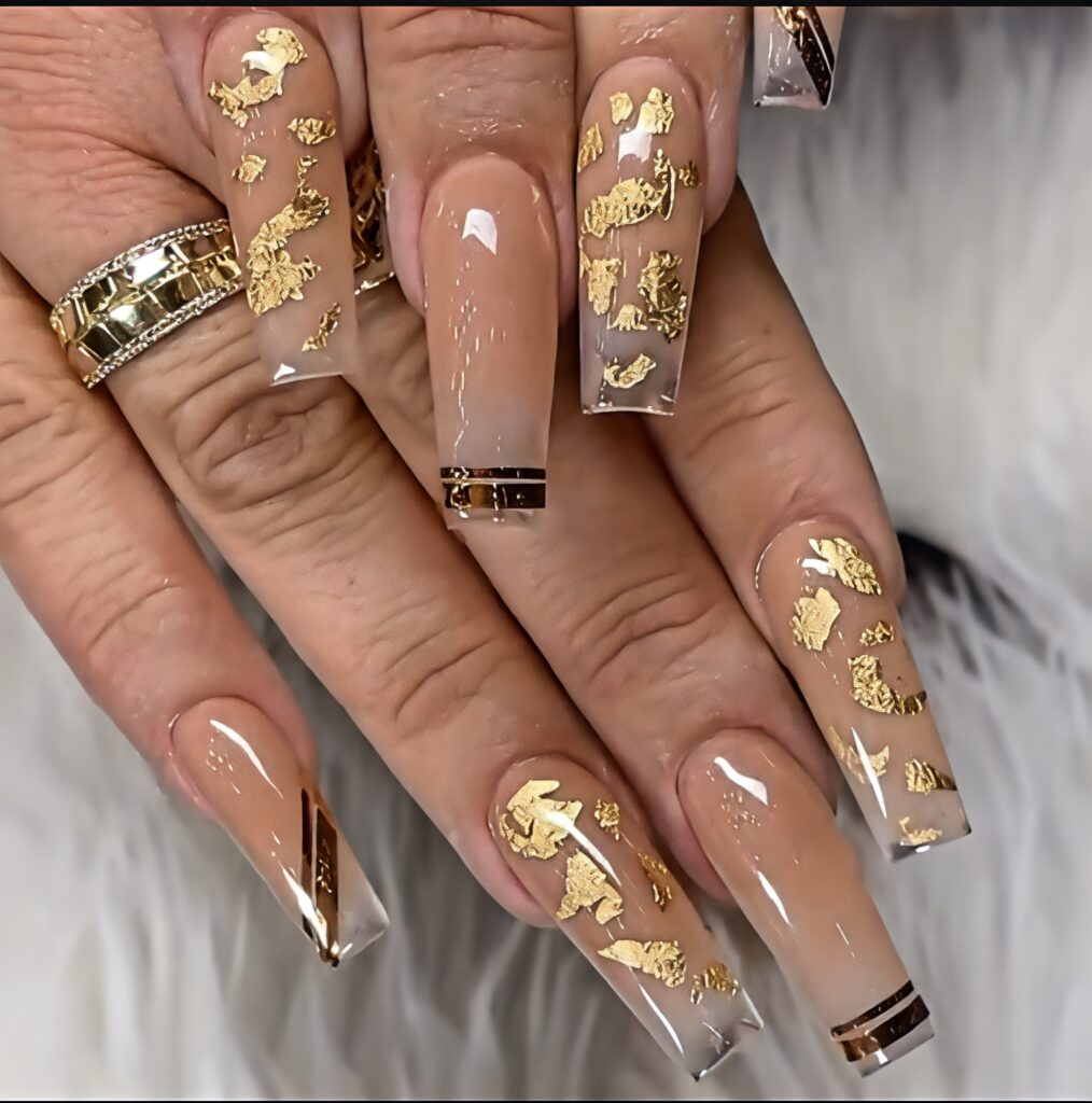 Golden foil coffin nails look rich and classy. A nude or light base with small gold foil pieces adds shine. This design feels elegant but not too heavy. The coffin shape makes the foil art look neat and stylish. It is perfect for weddings or special family functions. The golden shine looks beautiful in both daylight and evening lights. This nail style gives a royal and graceful summer appearance.