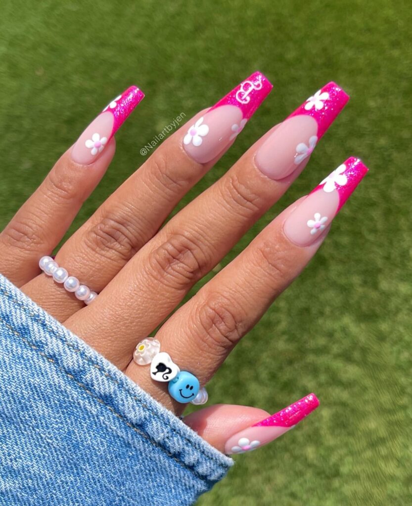 I love how coffin nails give enough space for designs like glitter, chrome or simple French tips with a twist. Some styles look playful with daisies and colors while others look classy with nude bases and soft tones.