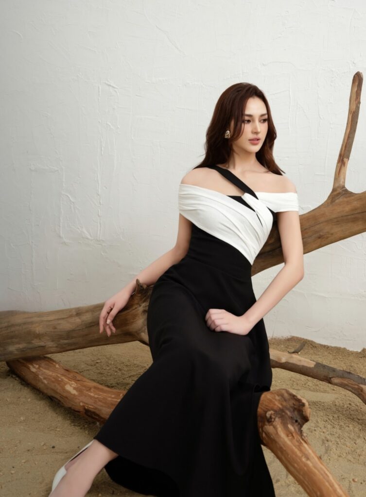 A black and white off-shoulder gown looks very graceful. The off-shoulder style adds a soft and stylish touch. It feels perfect for a grand celebration. Wear it with simple heels and . Let your hair fall naturally or style it softly. This outfit gives a beautiful and royal look.