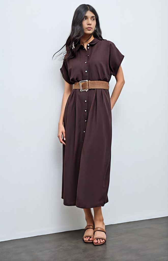 A brown twill shirt dress is simple and comfortable. It looks neat and easy to wear. The shirt style gives a smart and relaxed feeling at the same time. You can add a belt to shape your waist and wear neutral heels. This outfit feels natural and perfect for a simple but classy graduation look.