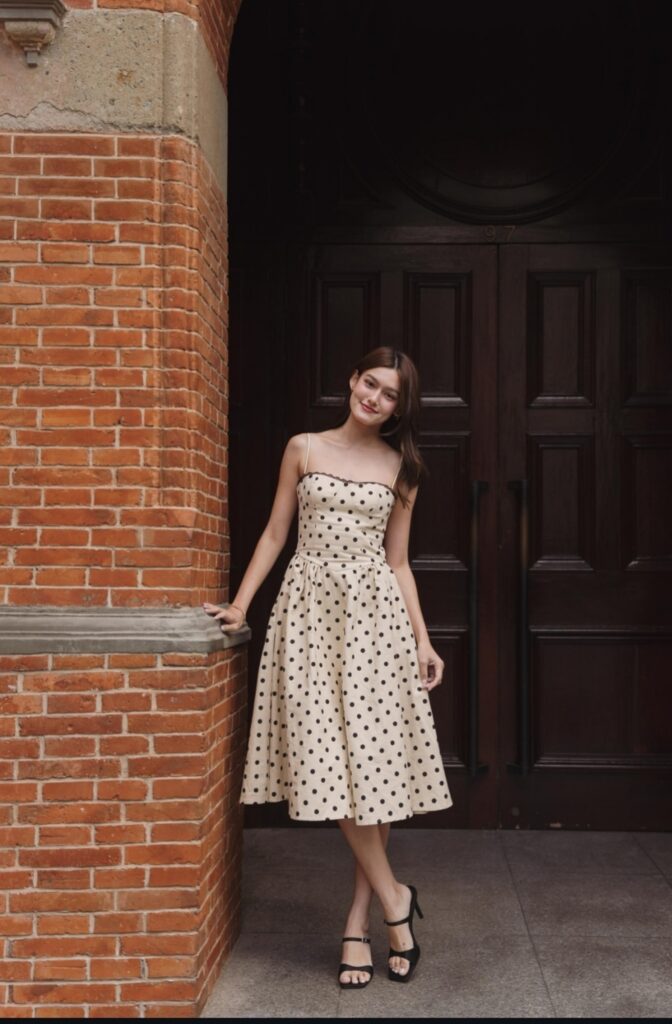 A cream polka dot chiffon ruffle midi dress looks sweet and soft. The small dots and ruffles add a cute and feminine touch. It feels light and flowy. Wear soft heels and light makeup. Add small pearl earrings. This outfit looks gentle and perfect for a happy and memorable graduation day.