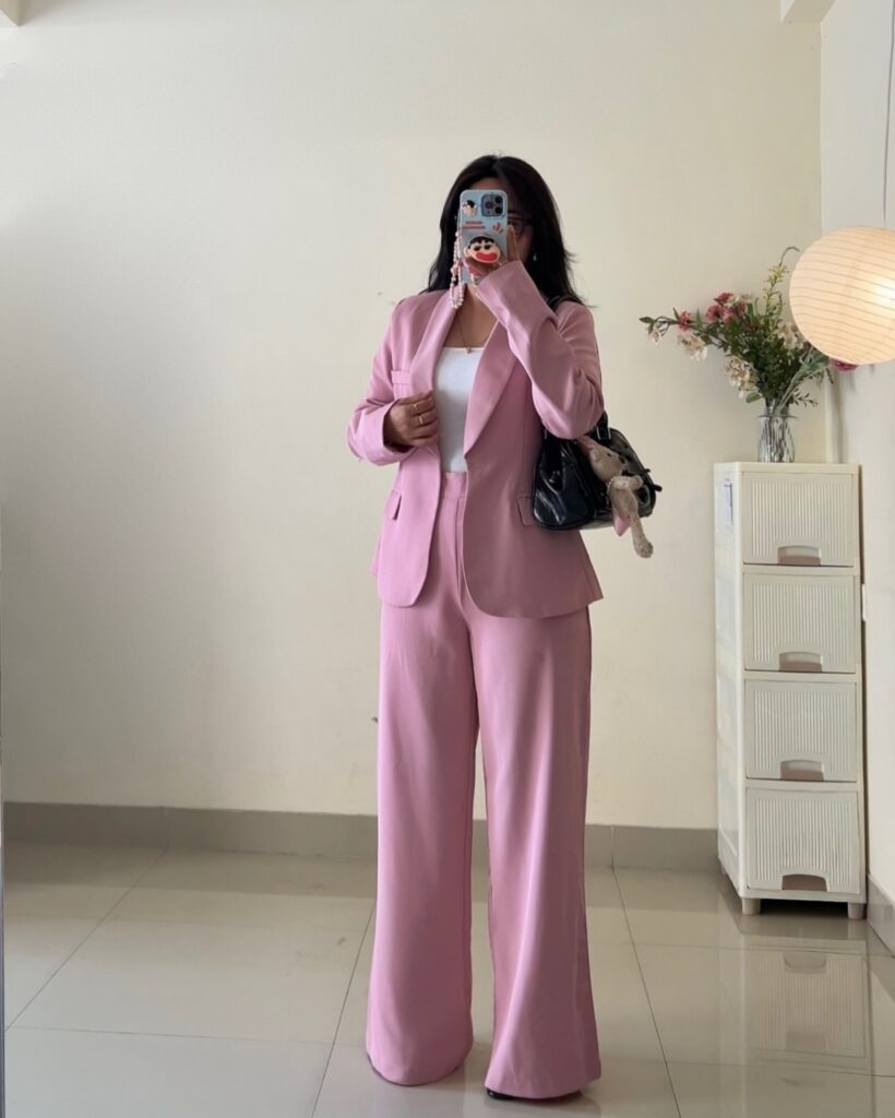 A pastel pink pantsuit looks soft but strong. It shows confidence while keeping a sweet and fresh look. The color feels perfect for spring or summer graduation.Wear a white top inside and nude heels. Keep your hair simple and neat. This outfit makes you feel proud and stylish at the same time.