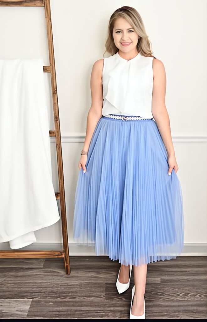 11. White Ribbed Top with Royal Blue Pleated Midi Skirt