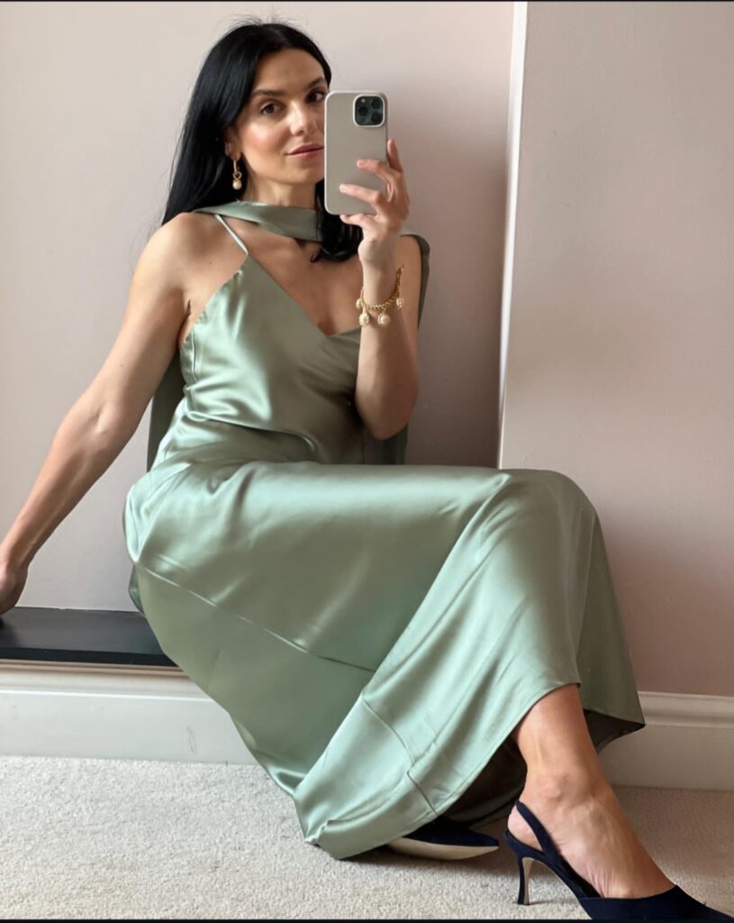 A sage green satin slip dress looks smooth and elegant. The satin fabric shines softly in light. It feels simple but very beautiful.Pair it with nude or silver heels and light jewelry. Keep your hairstyle natural. This outfit looks calm, classy, and perfect for special photos.
