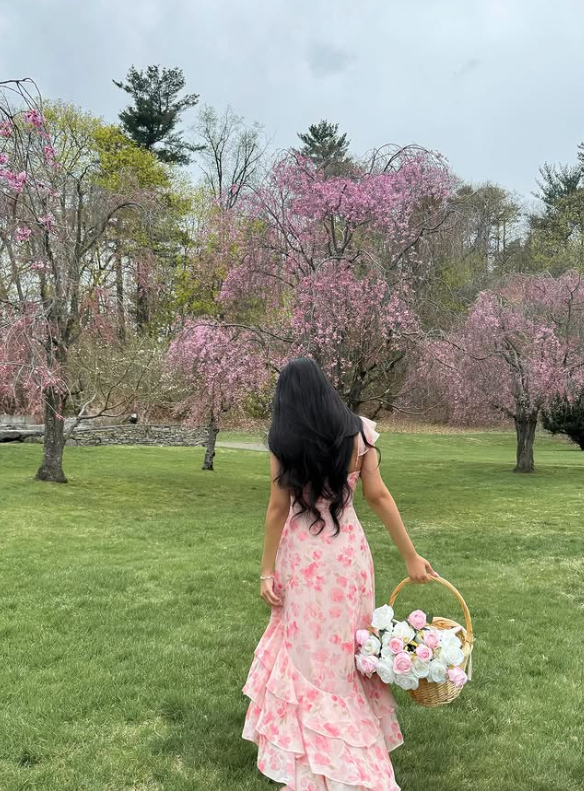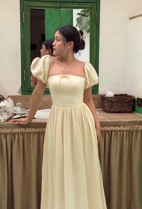 A yellow tiered maxi dress looks dreamy and soft. The layered design adds volume and movement when you walk. The light yellow color feels happy and perfect for spring graduation.Pair it with simple sandals or heels and light makeup. Keep accessories minimal. This outfit makes you feel graceful and picture-ready on your special day.
