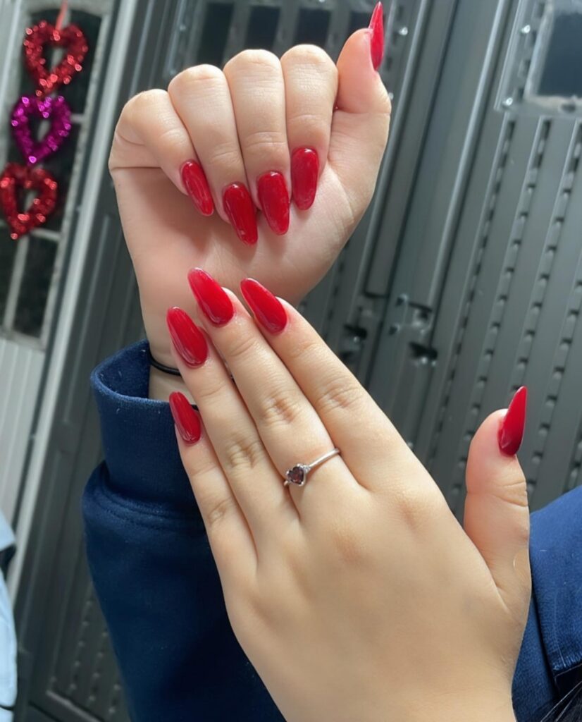 Red almond nails show confidence, passion and strength. Red is a timeless color that never goes out of style. The almond shape keeps the bold color elegant and graceful. This style works well for special occasions and strong personalities. These nails feel powerful and confident. They help you express bold beauty with pride.