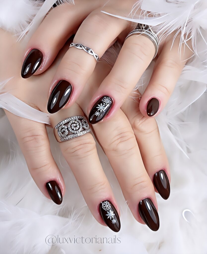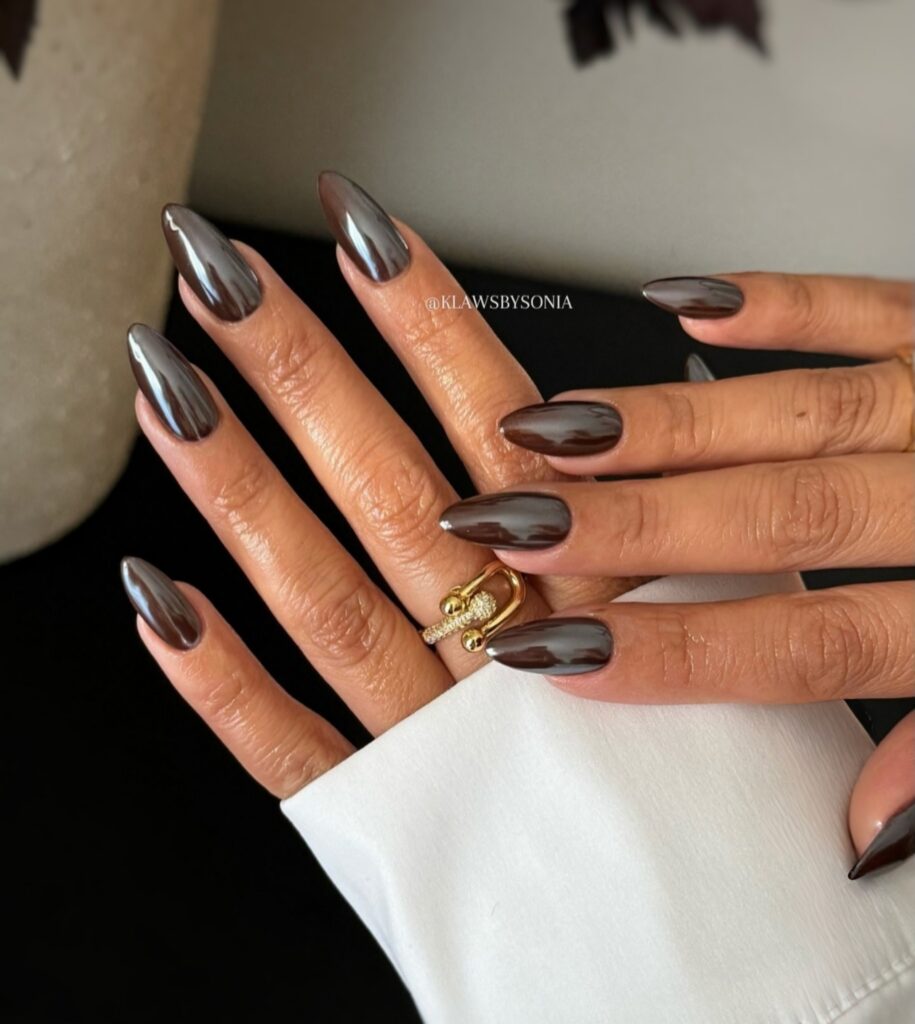 Brown almond nails give a warm and grounded look. This color feels natural, mature and comforting. Brown shades match many outfits and look perfect in all seasons. The almond shape keeps the dark tone soft and elegant. These nails are great for people who love earthy colors and simple beauty. They feel classy without needing extra designs or shine.