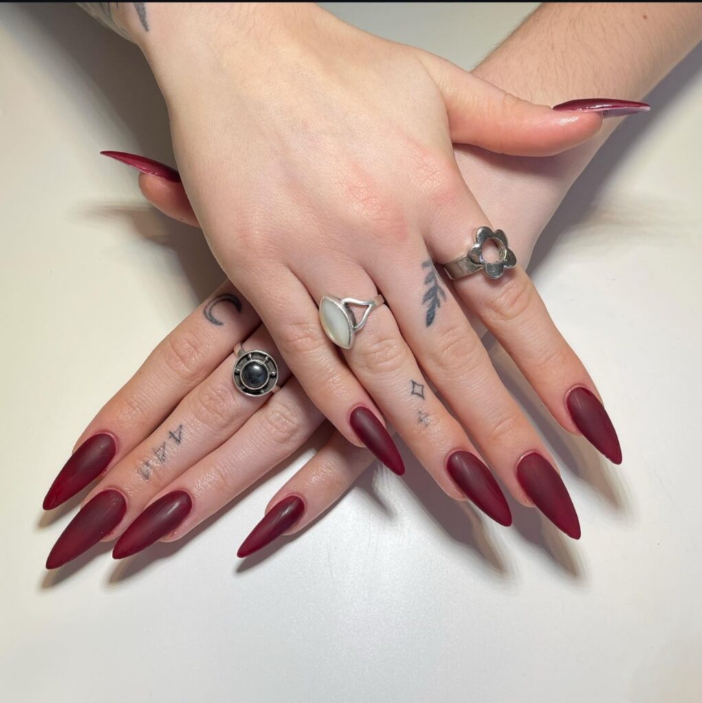 This design mixes sharp and soft styles together. It feels modern and unique. The almond shape keeps the look elegant while adding edge.These nails feel confident and creative. They express strong personal style.