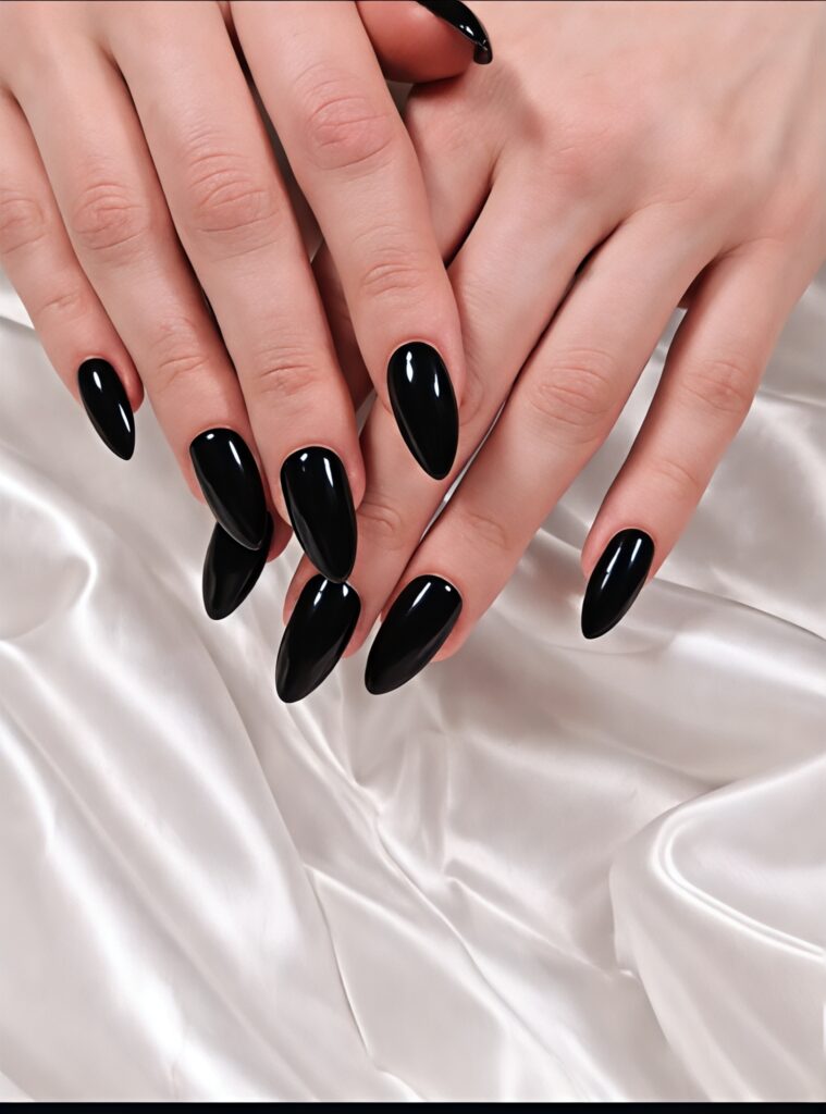 Black almond nails look bold, confident and powerful. The dark color shows strength while the almond shape adds softness. This balance makes the nails look stylish and not too harsh. Black almond nails are perfect for people who love modern fashion and strong expression.