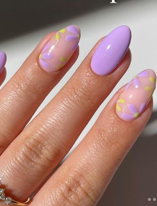 Floral almond nails are soft and artistic. Small flowers add beauty and charm to the nails. This design feels fresh and gentle. It suits spring, summer and romantic moods perfectly.