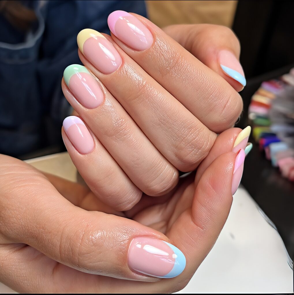 Pastel rainbow French nails use soft and light colors instead of bright shades. This gives a calm and soothing look. Each nail can have a different pastel color creating a gentle rainbow effect. It is perfect for everyday wear and looks very pretty. This design is ideal for people who like subtle colors but still want something fun and creative on their nails.