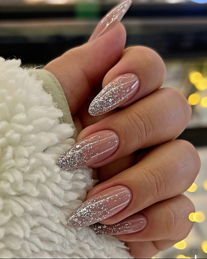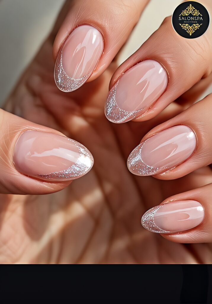 Glitter ombre French nails combine sparkle with a soft fade effect. The glitter starts at the tip and slowly blends into the base. This creates a magical and shiny look. It is perfect for parties and special events. You can use silver, gold or colorful glitter. This design looks stylish and eye-catching while still feeling soft and elegant. It adds a glamorous touch to your nails.