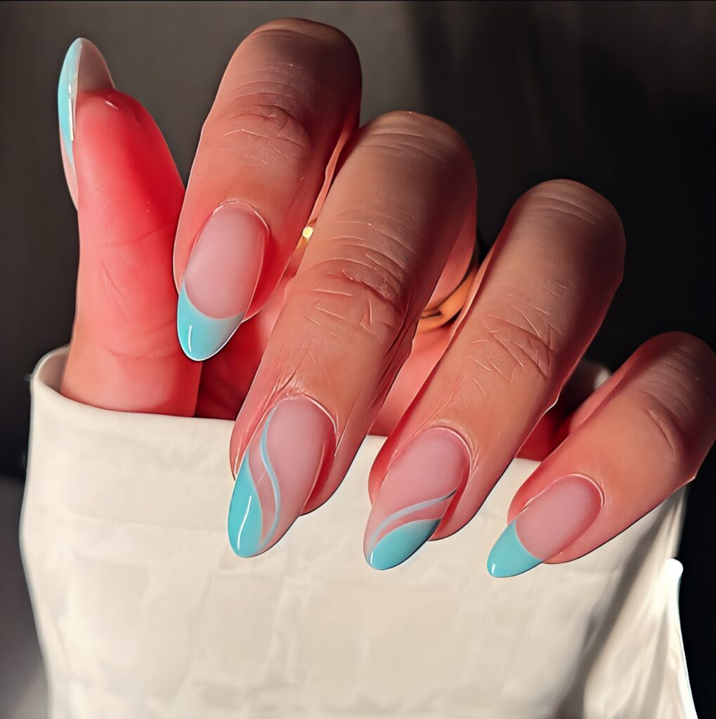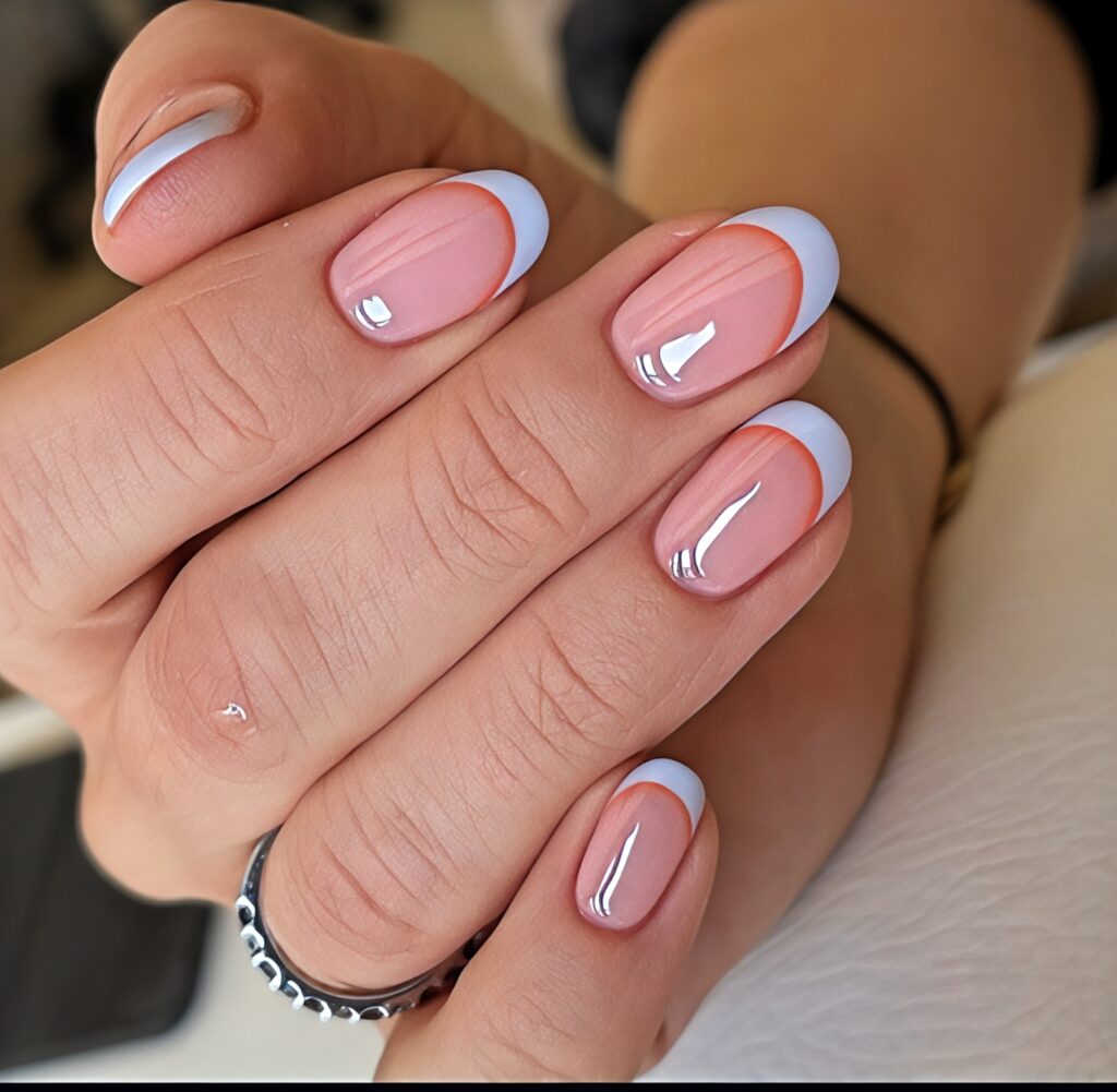 Swirl French nails use curved and flowing lines on the tips. You can mix two or more colors to create beautiful swirl patterns. This design looks very trendy and artistic. It adds movement and style to your nails. Perfect for people who love creative designs. Swirl nails are great for summer because they look fun, colorful and full of life.