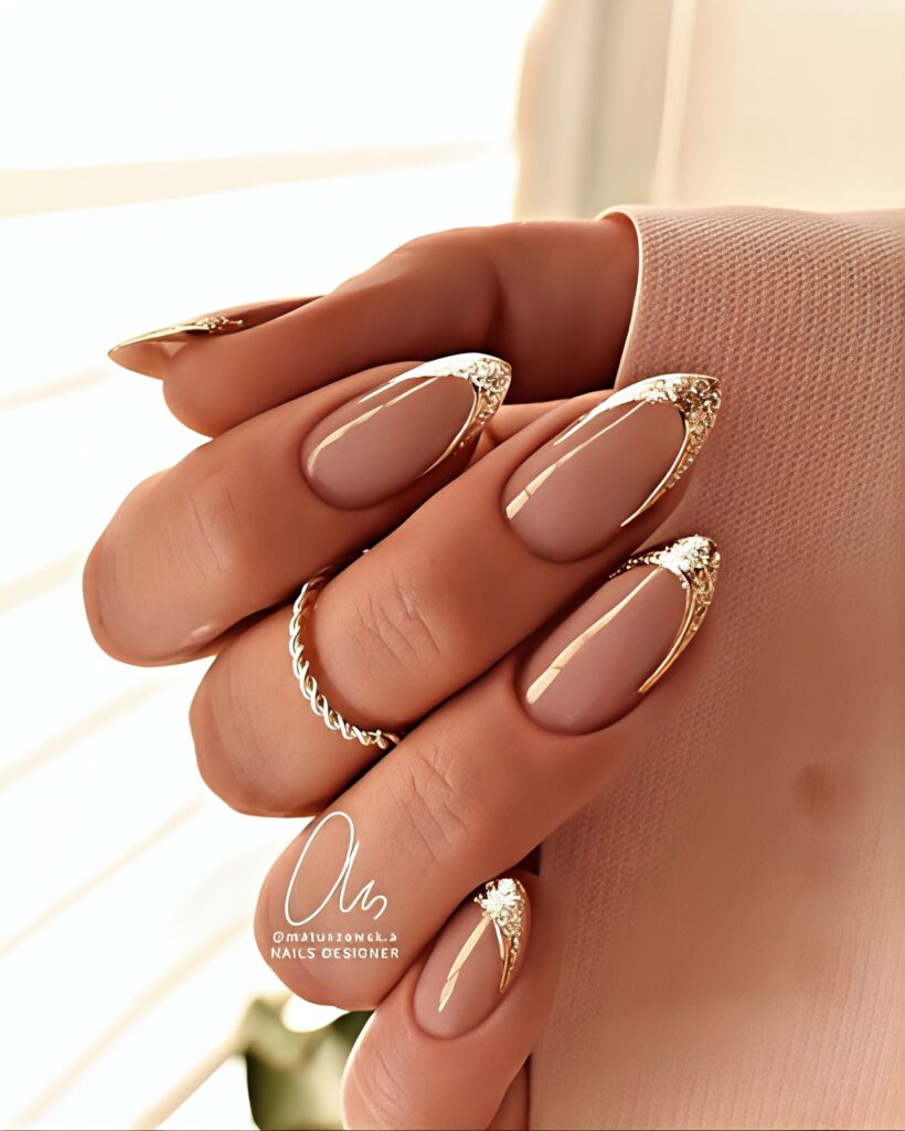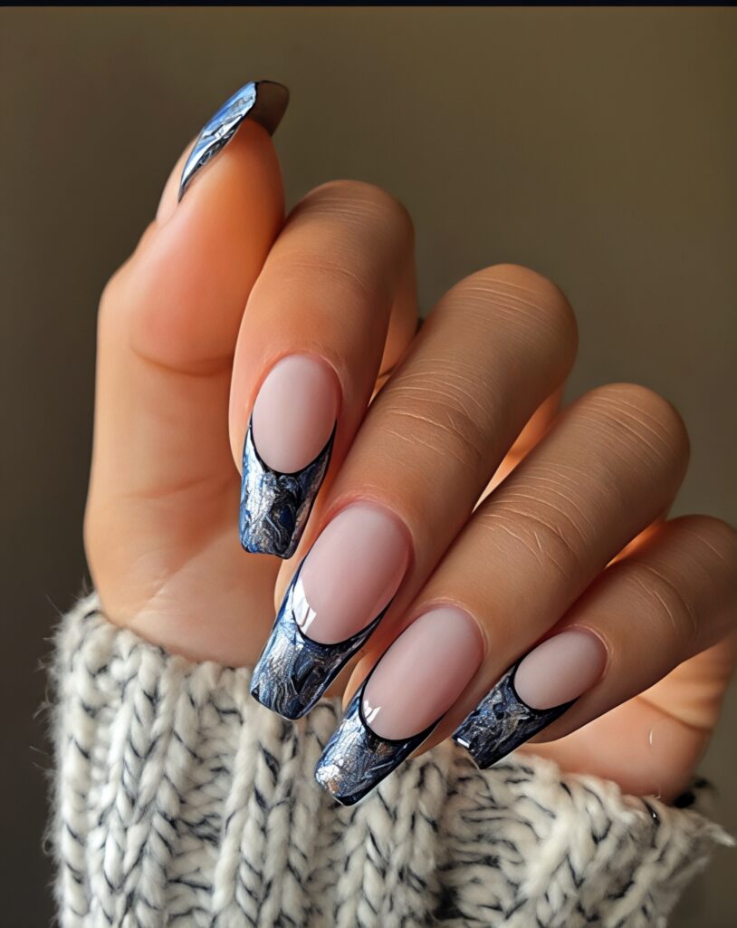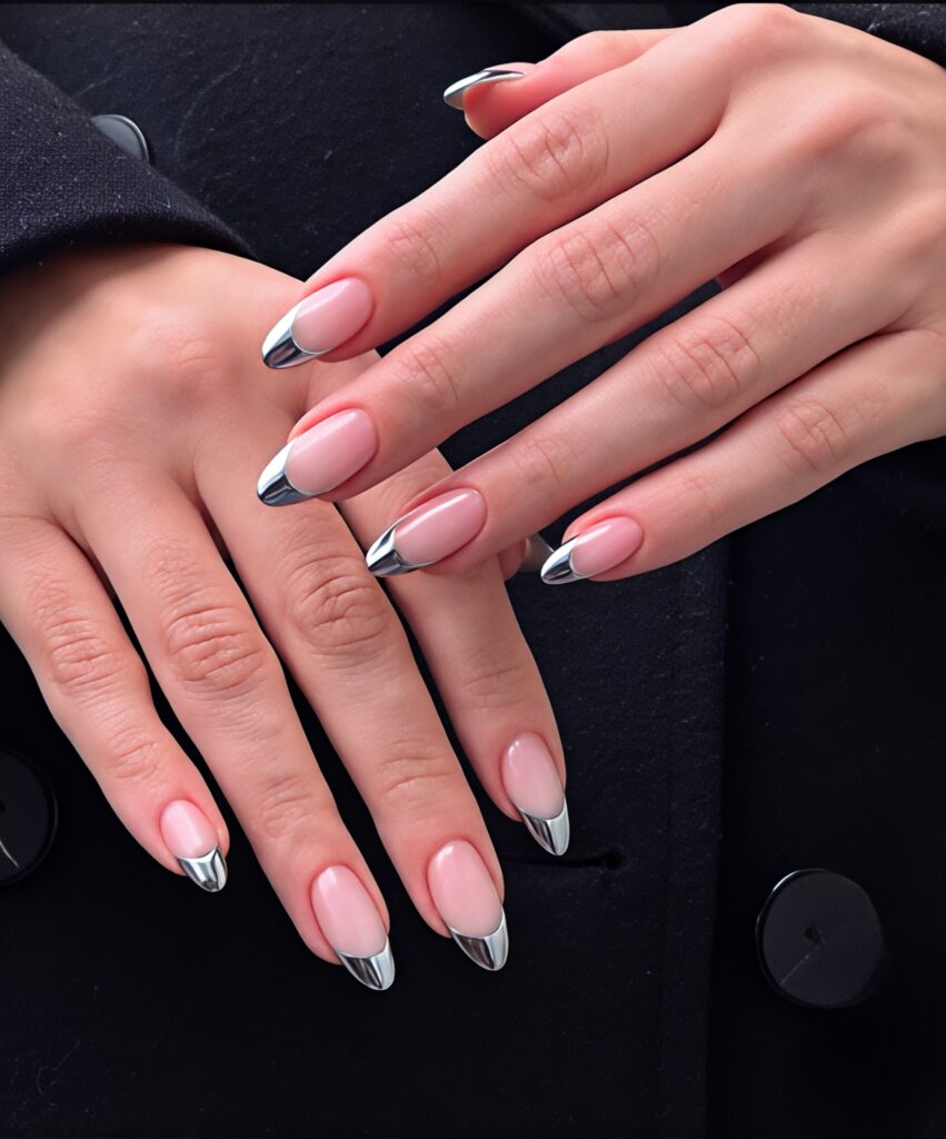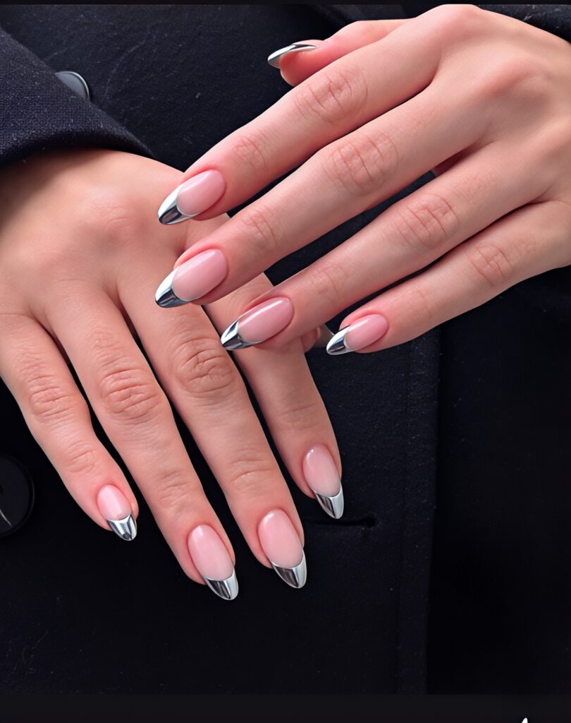 Metallic French nails use shiny colors like silver, bronze or chrome. These shades give a reflective and stylish finish. It looks bold yet elegant at the same time. This design is perfect for parties and evening events. It adds a modern touch to your nails. If you want something eye catching and trendy metallic French nails are a great option.