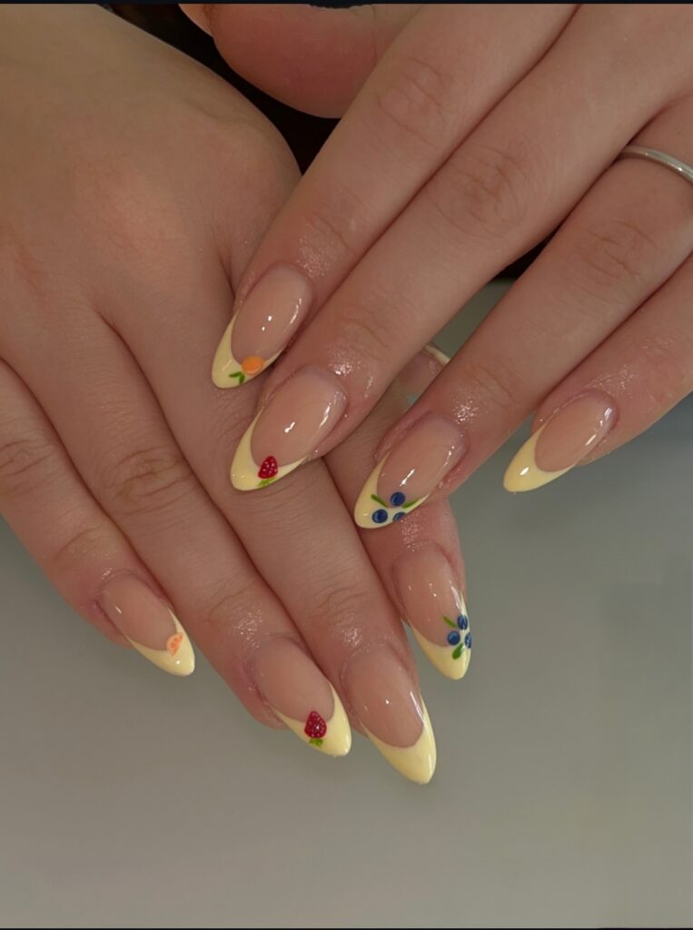 Fruit French nails are playful and perfect for summer vibes. You can draw small fruit designs like watermelon, lemon or strawberry on the tips. These bright and colorful designs make your nails look fresh and cheerful. It adds a fun and creative touch to your overall look. This style is great for vacations, beach days and casual outings. If you like fun designs this is a must-try idea.