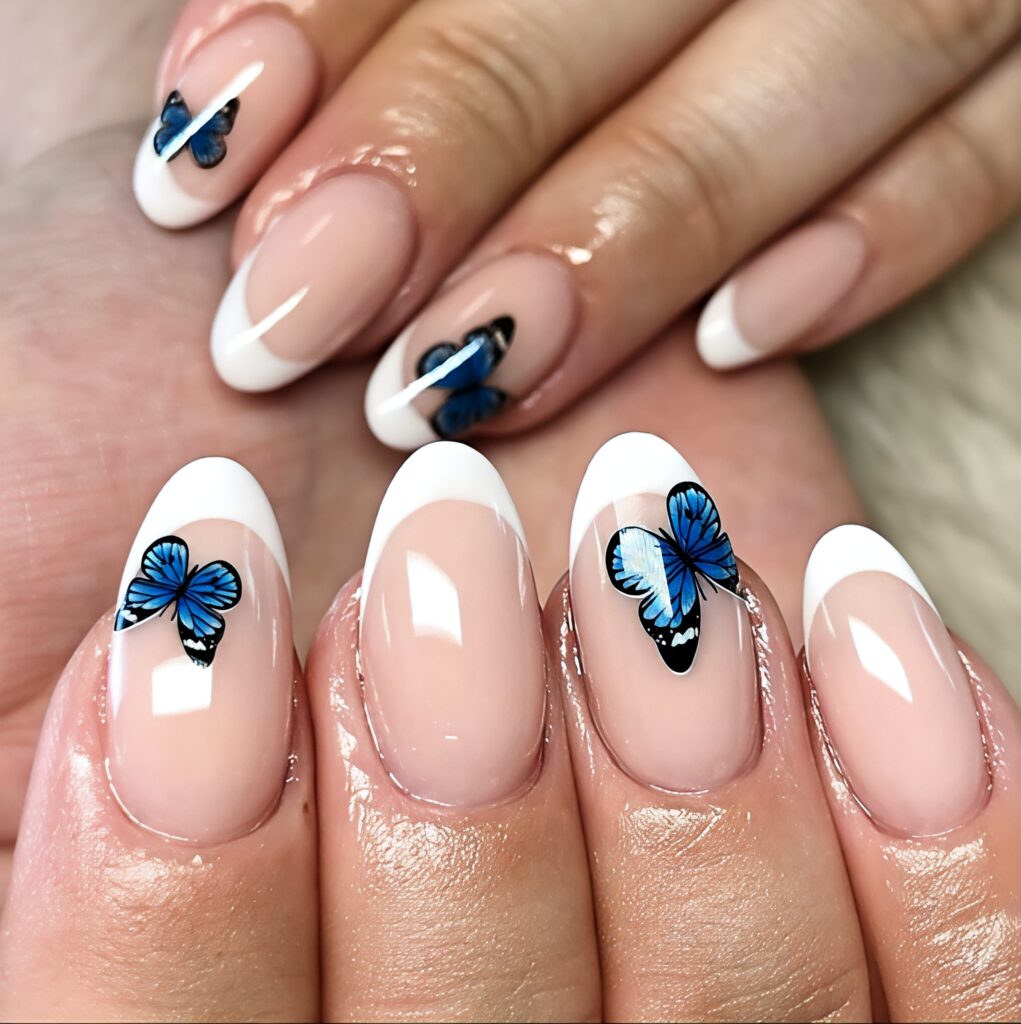 Butterfly French nails look soft, pretty and dreamy. You can add small butterfly designs near the tips using light colors. This gives a delicate and elegant touch to your nails. It is perfect for summer photos and special occasions. This design feels light and feminine. If you like artistic and gentle nail designs butterfly French nails are a beautiful option to try this season.