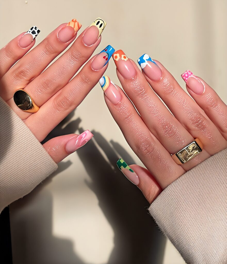 Mix and match French nails allow you to combine different styles on each nail. You can use glitter, pastel, neon or designs together. This creates a fun and unique look. It shows your creativity and personal style. This design is perfect for people who love experimenting. It is great for summer because it looks colorful, playful and full of personality.