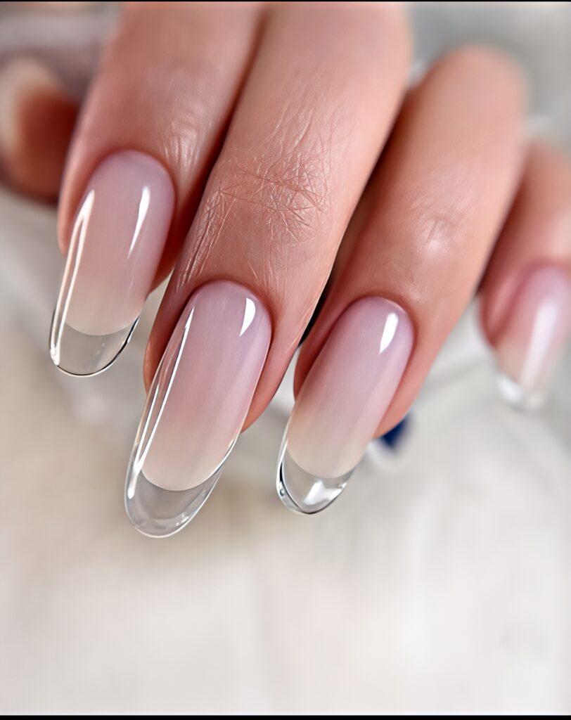 Transparent French nails use a clear or see-through base with defined tips. This creates a modern and unique look. It feels light and stylish. You can combine it with colors or glitter tips for extra beauty. This design is very trendy and perfect for people who like minimal yet creative styles. It looks clean and different from regular nail designs.