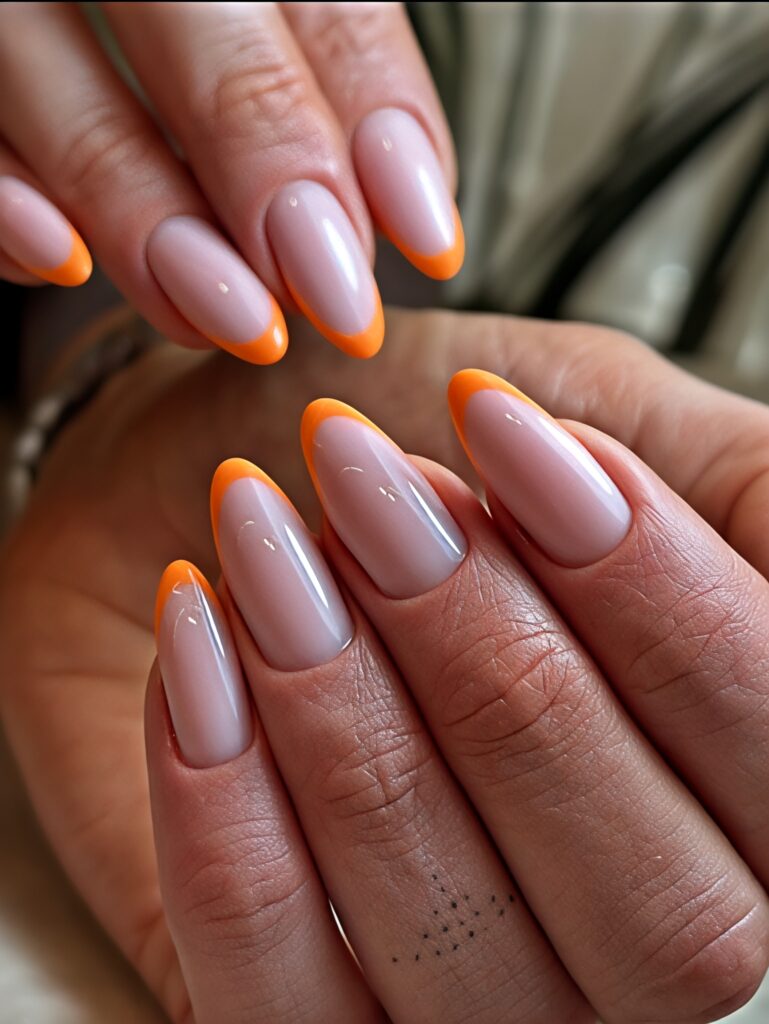 Orange French nails look bright, warm and full of energy. This color is perfect for sunny summer days. It makes your nails stand out and look cheerful. You can use soft peach or bold orange shades depending on your style. This design is great for vacations, beach trips and fun outings. It adds a lively and happy touch to your overall look.