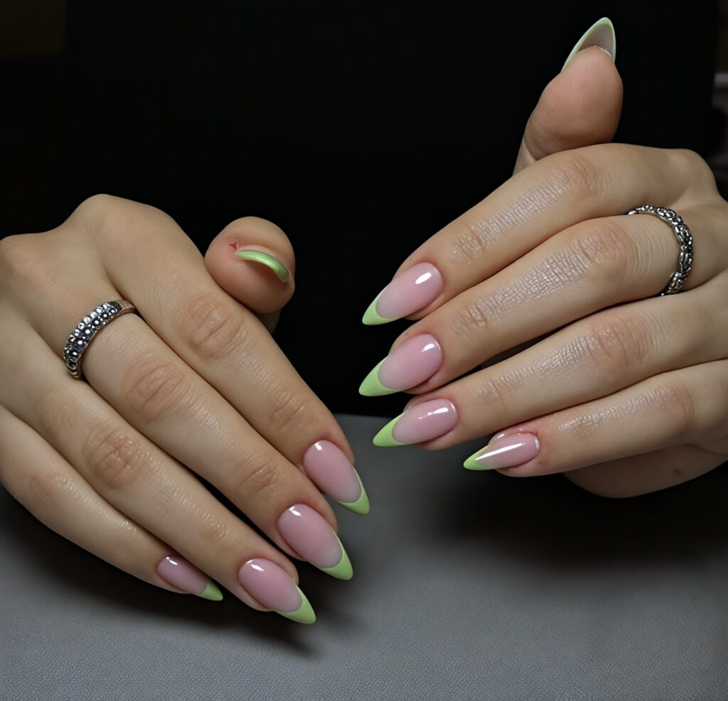 Green French nails give a natural and fresh look. Shades like mint, olive or neon green can be used for tips. This design feels very lively and perfect for summer. It connects with nature and gives a cool vibe. It is great for casual wear and outdoor events. If you like fresh and unique colors green French nails are a good option.