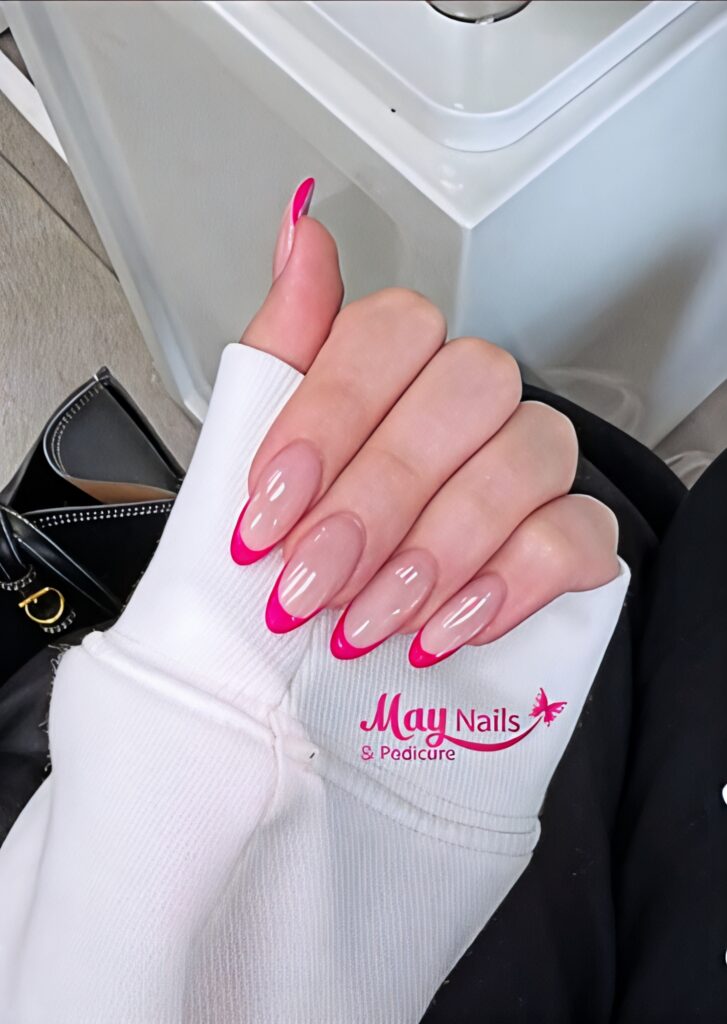 Pink French nails are soft, cute and very popular. Instead of white tips you use pink shades. It gives a sweet and girly look. You can choose light pink for a soft style or bright pink for a bold look. This design is perfect for summer and looks great on all ages. It adds a fresh and charming touch to your nails.
