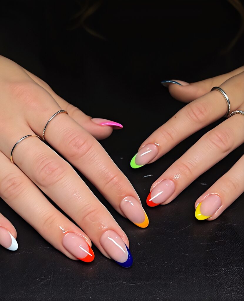 Colorful French nails use different shades on each nail tip instead of one color. You can try rainbow colors or mix your favorite shades. This design looks fun, playful and full of energy. It is very popular among young girls and perfect for summer vibes. It adds creativity to your look and makes your nails stand out. This style is great for casual outings and fun occasions.